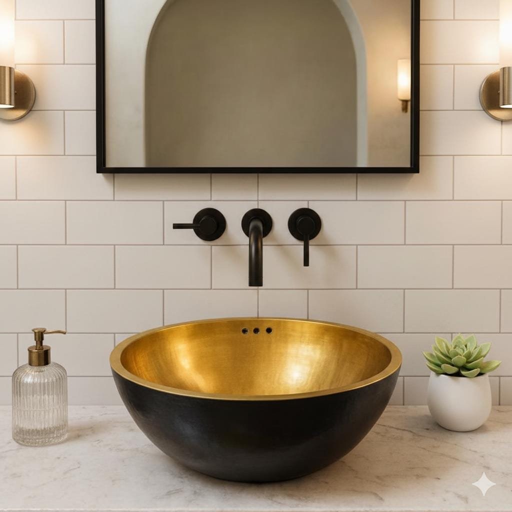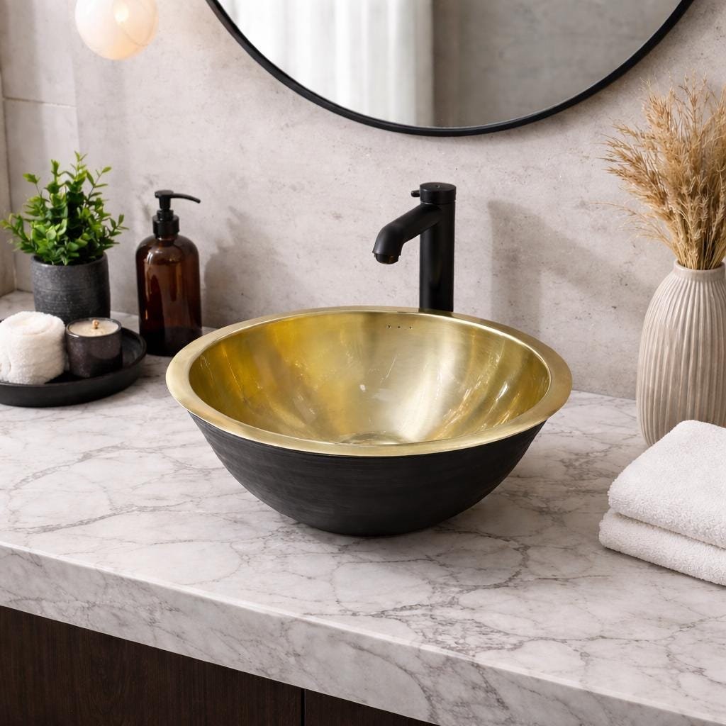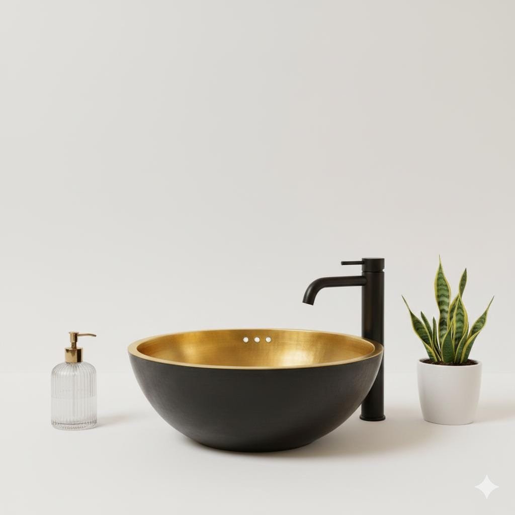 A handcrafted Moroccan brass vessel sink featuring a rich gold interior and deep black exterior for bold, elegant contrast.
