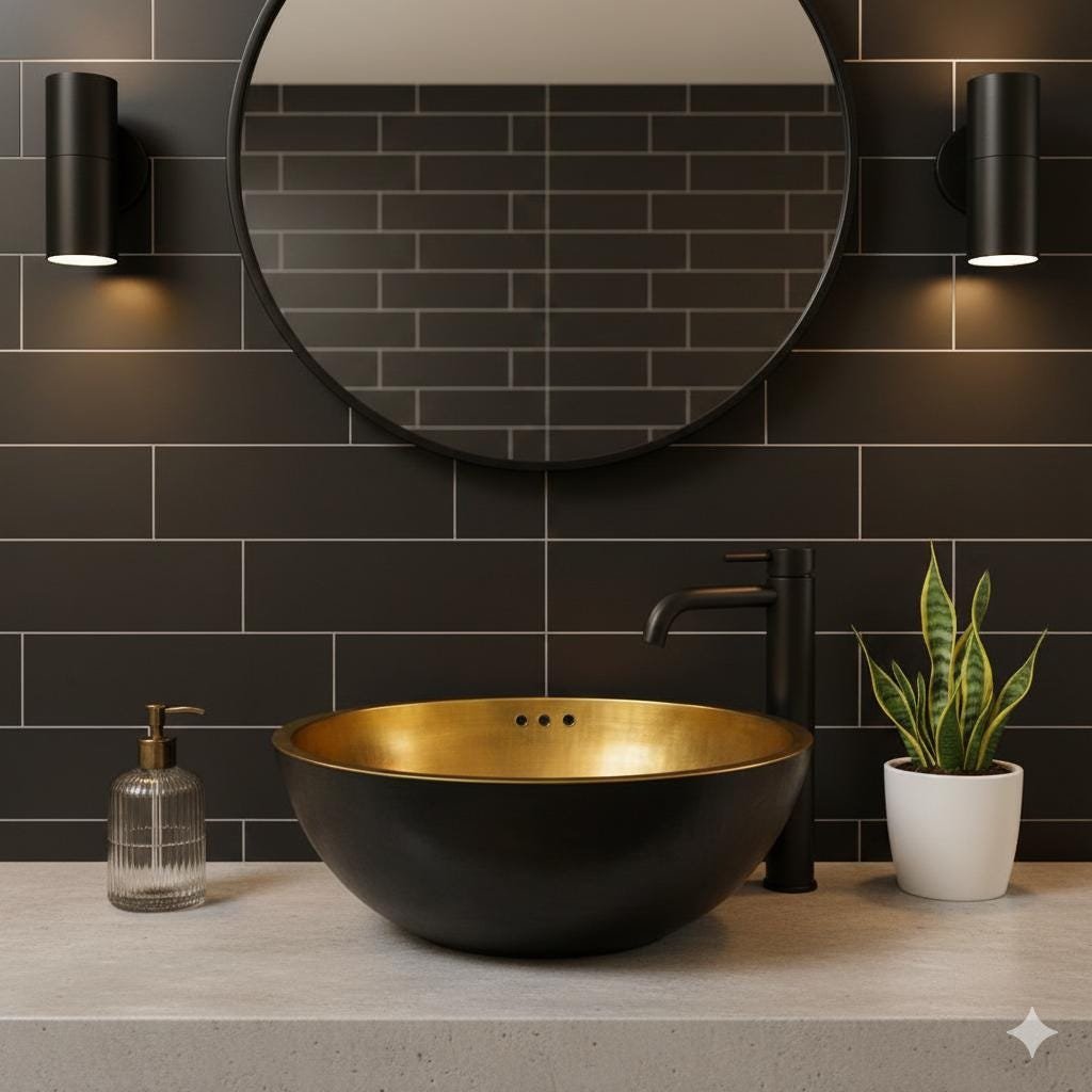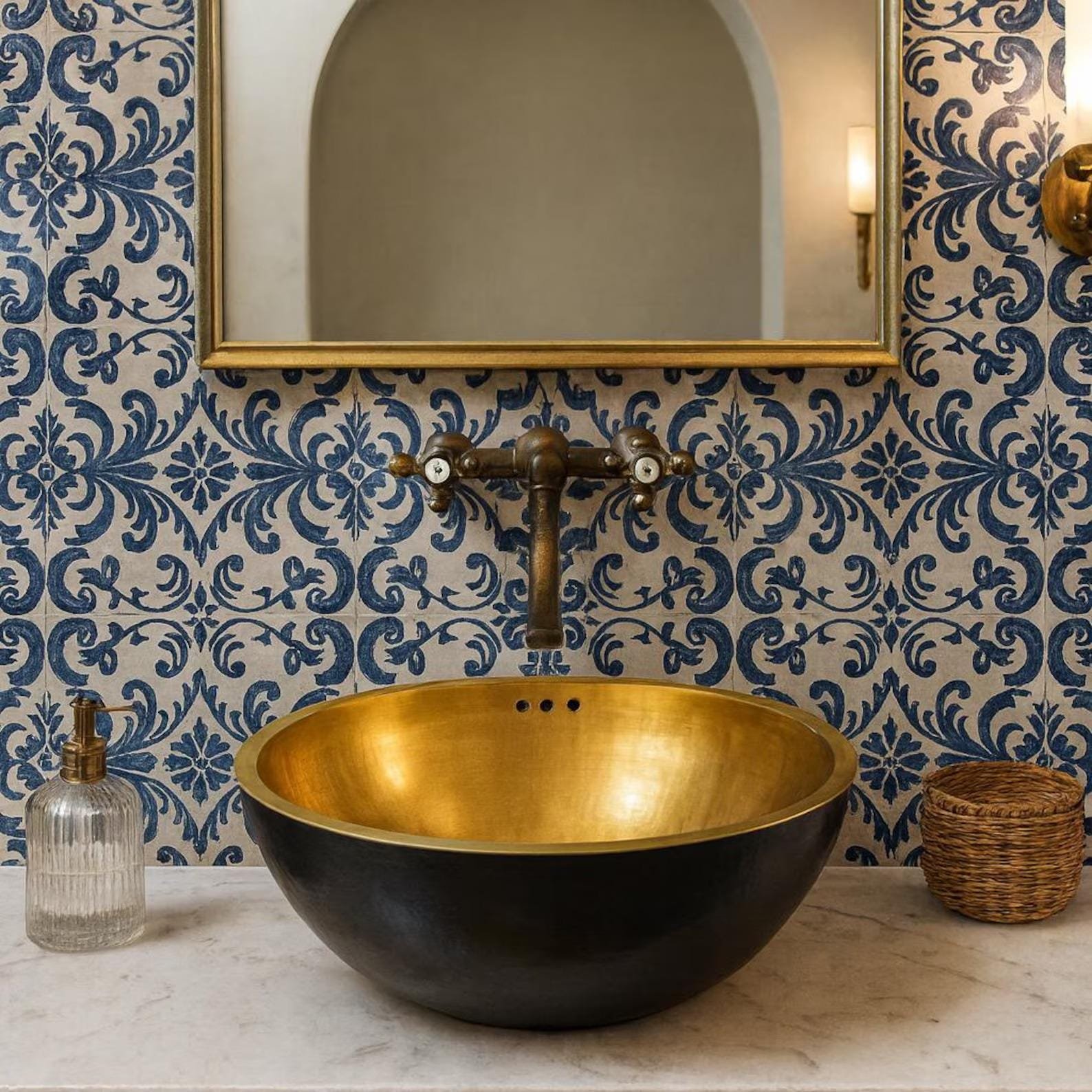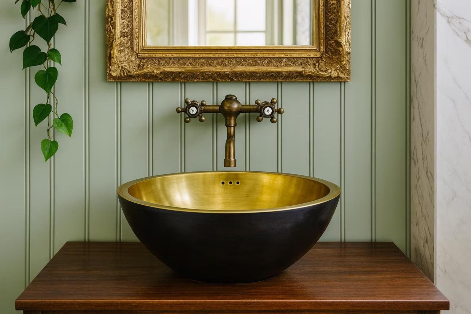 A handcrafted Moroccan brass vessel sink featuring a rich gold interior and deep black exterior for bold, elegant contrast.