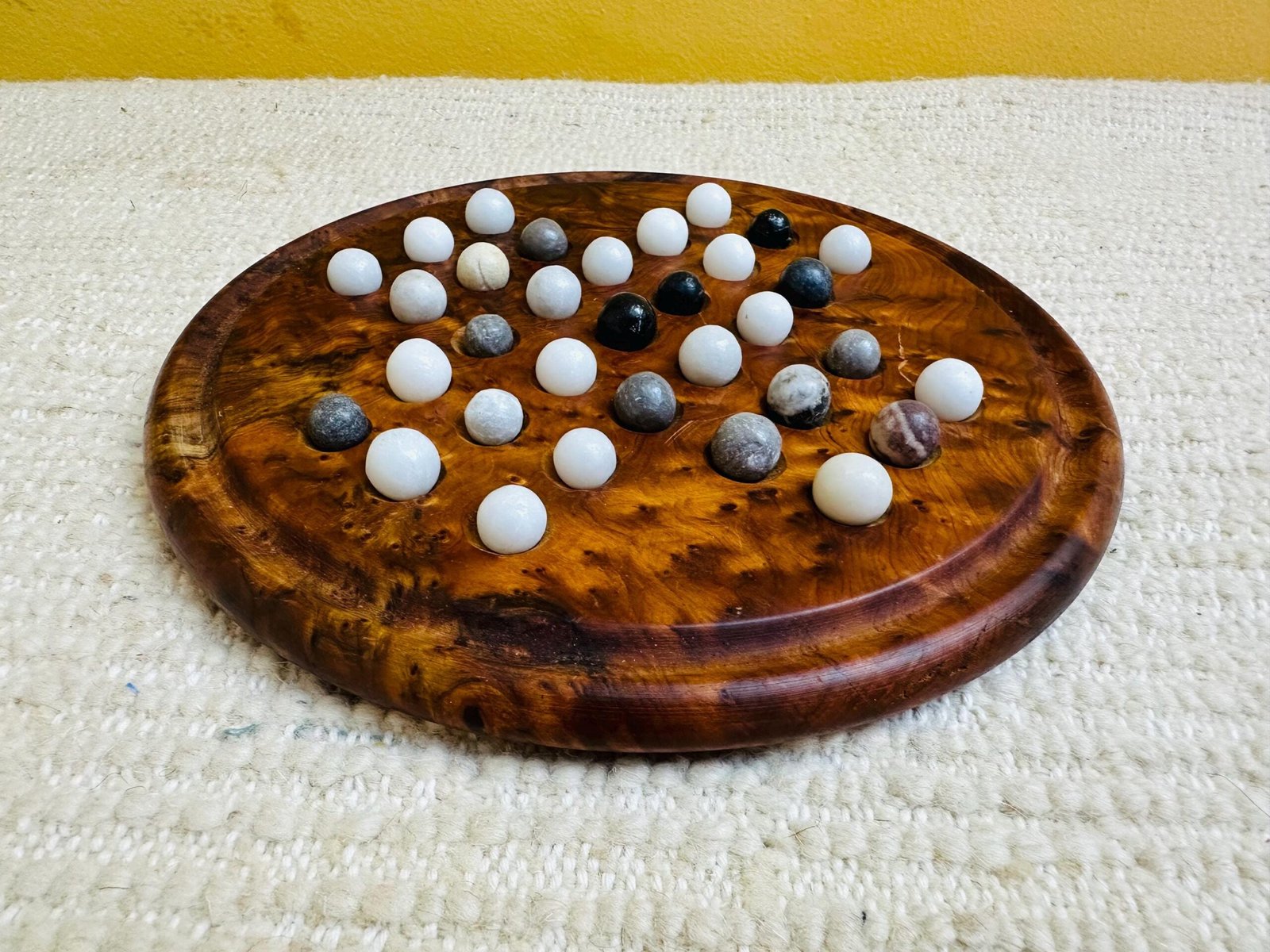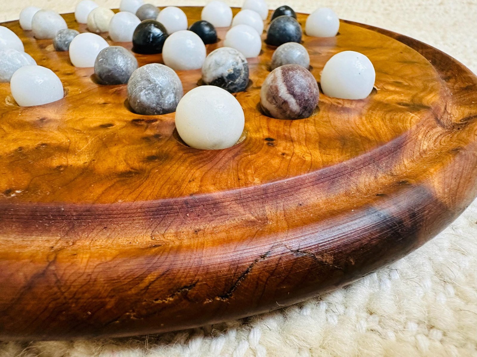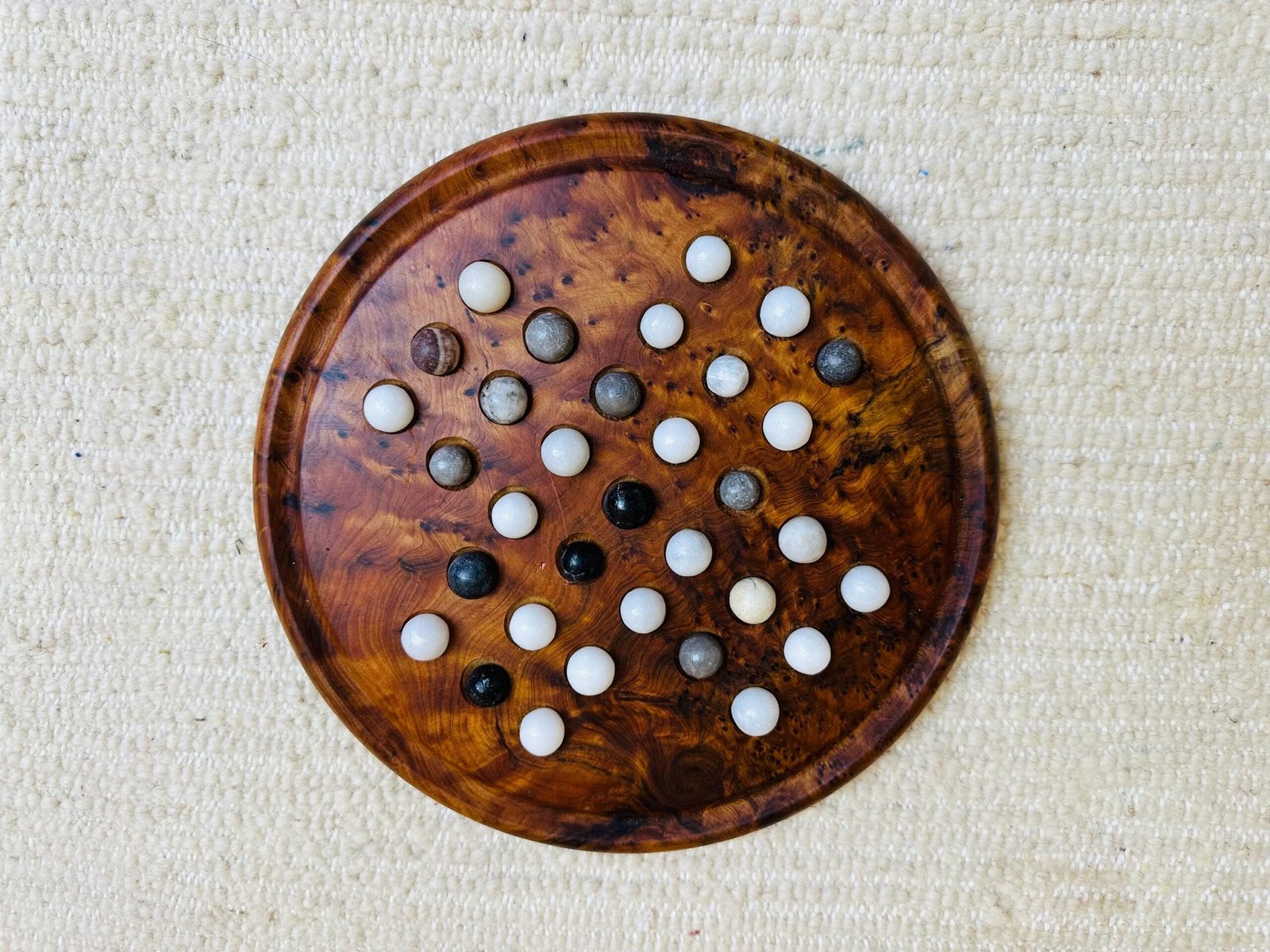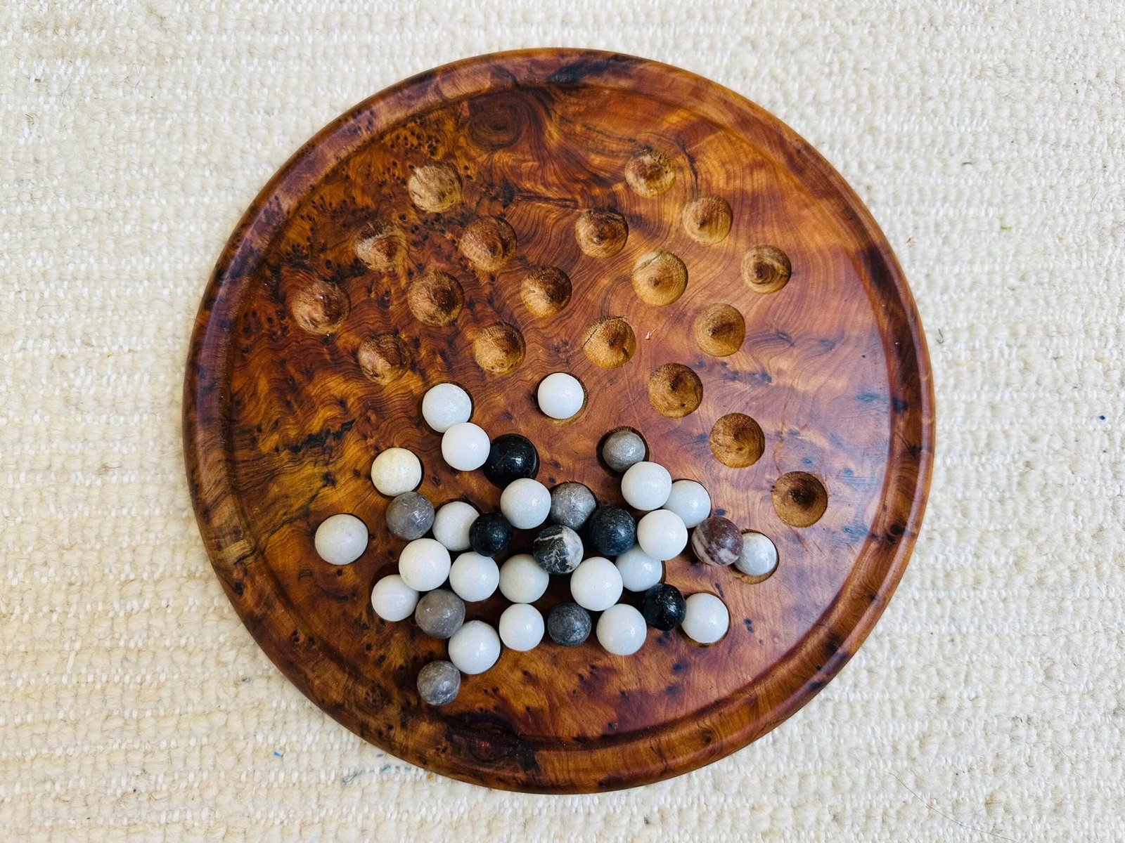 Handcrafted from rich Moroccan thuya wood, this artisan solitaire game board includes natural marble stone balls for timeless play.