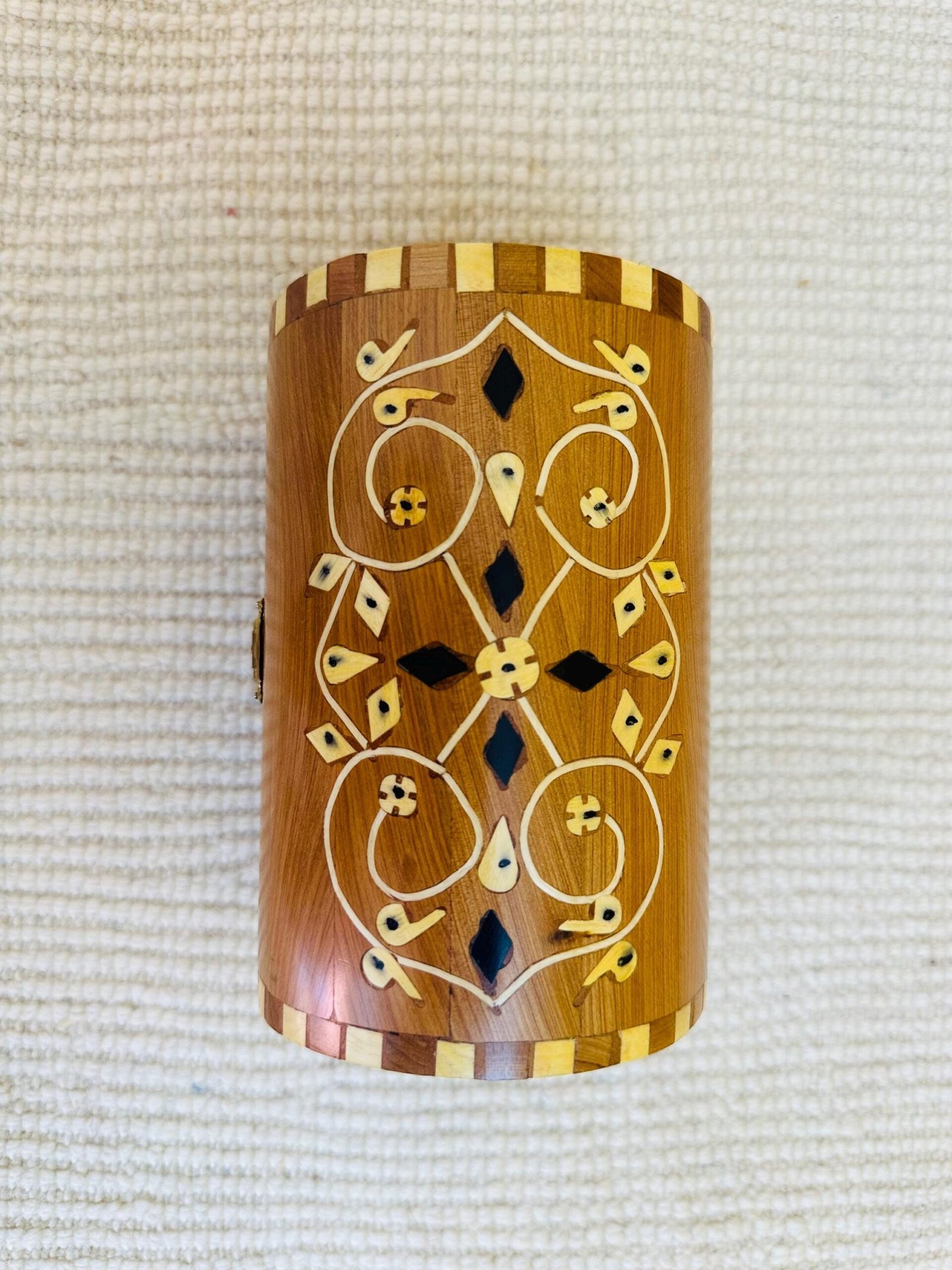 Handmade from fragrant Moroccan cedar wood and accented with delicate bone inlay, this vintage jewelry box combines heritage artistry with practical elegance.