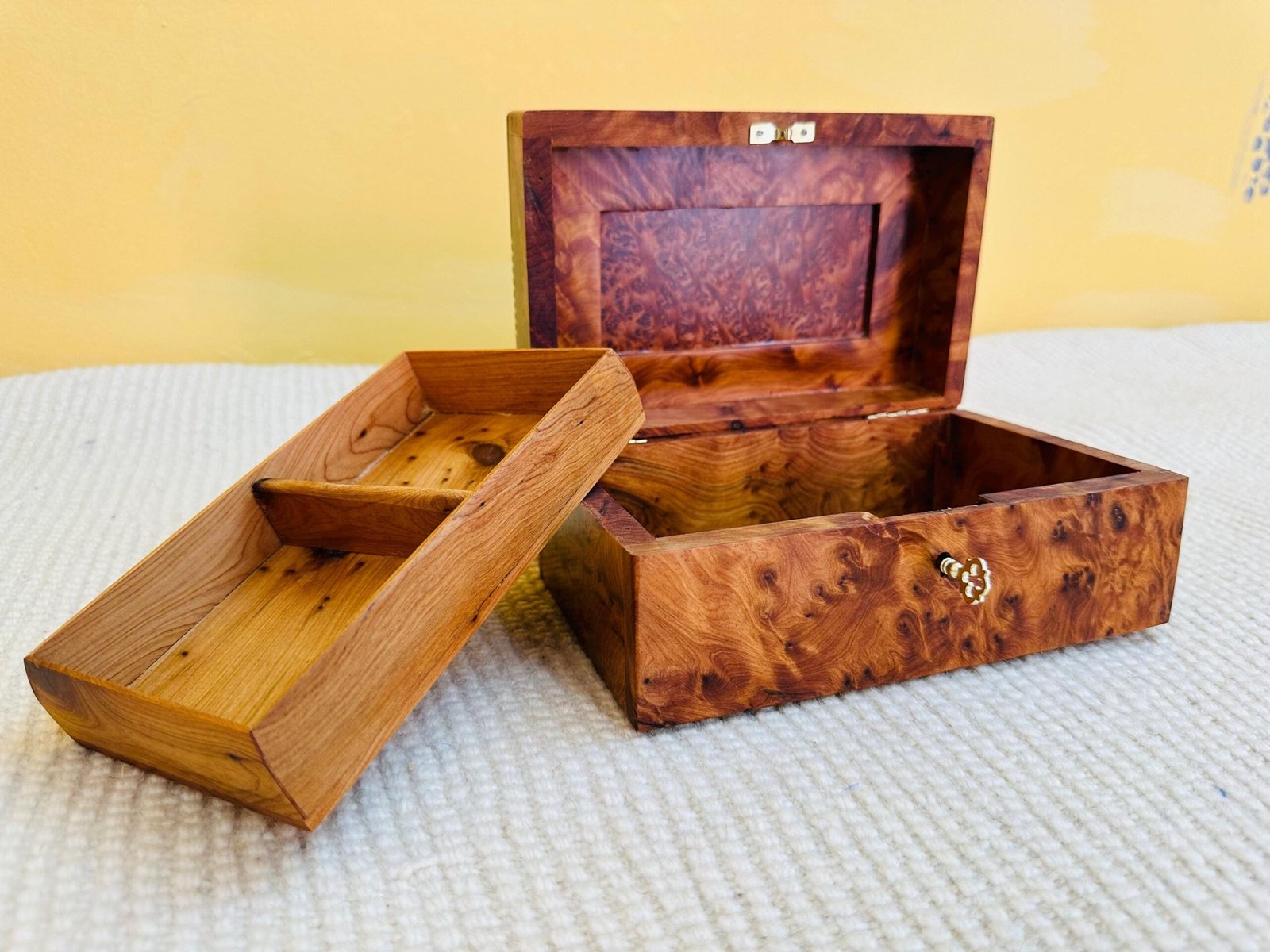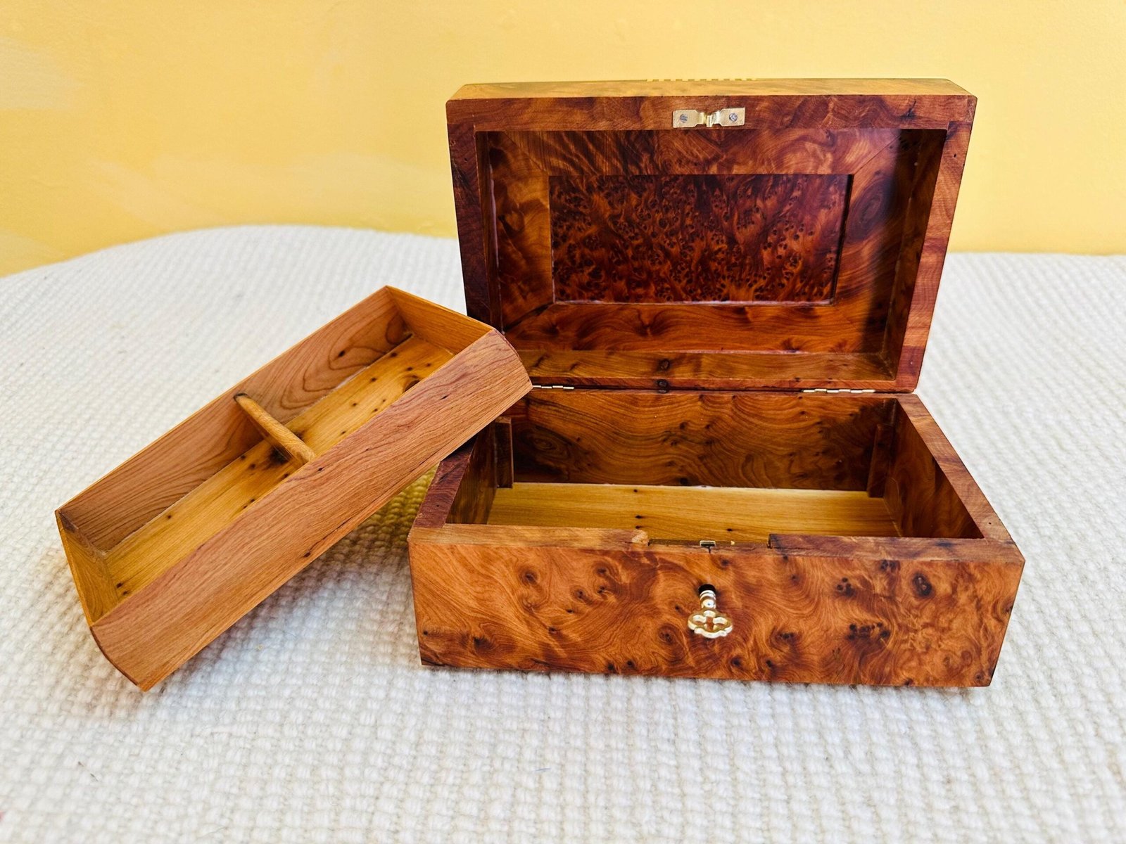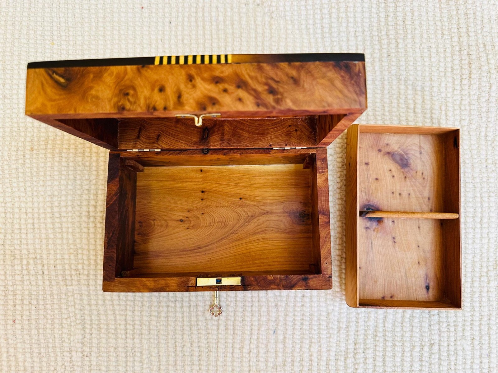 The box is functional as well as beautiful, featuring a working lock and its original ornate key. It opens to reveal a clean, aromatic cedar wood interior, naturally protecting its contents. A single divider helps to organize your jewelry, watches, or cherished keepsakes.