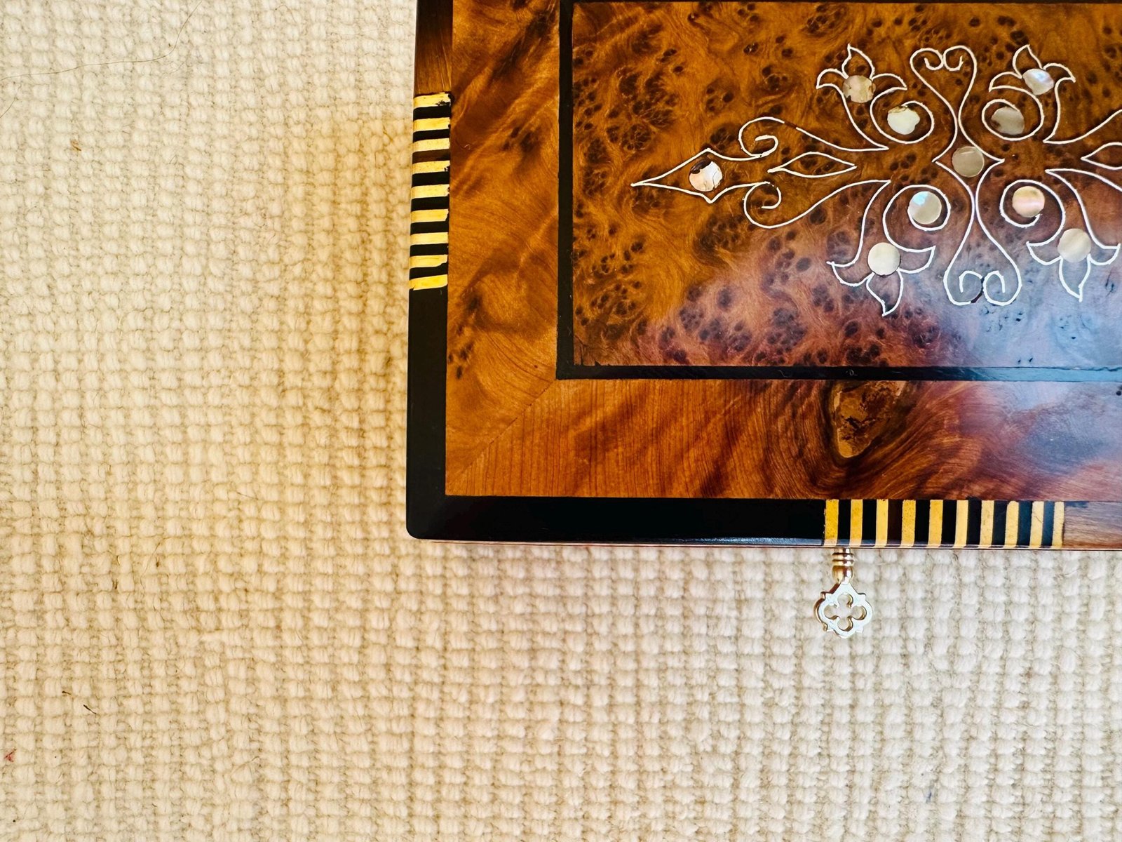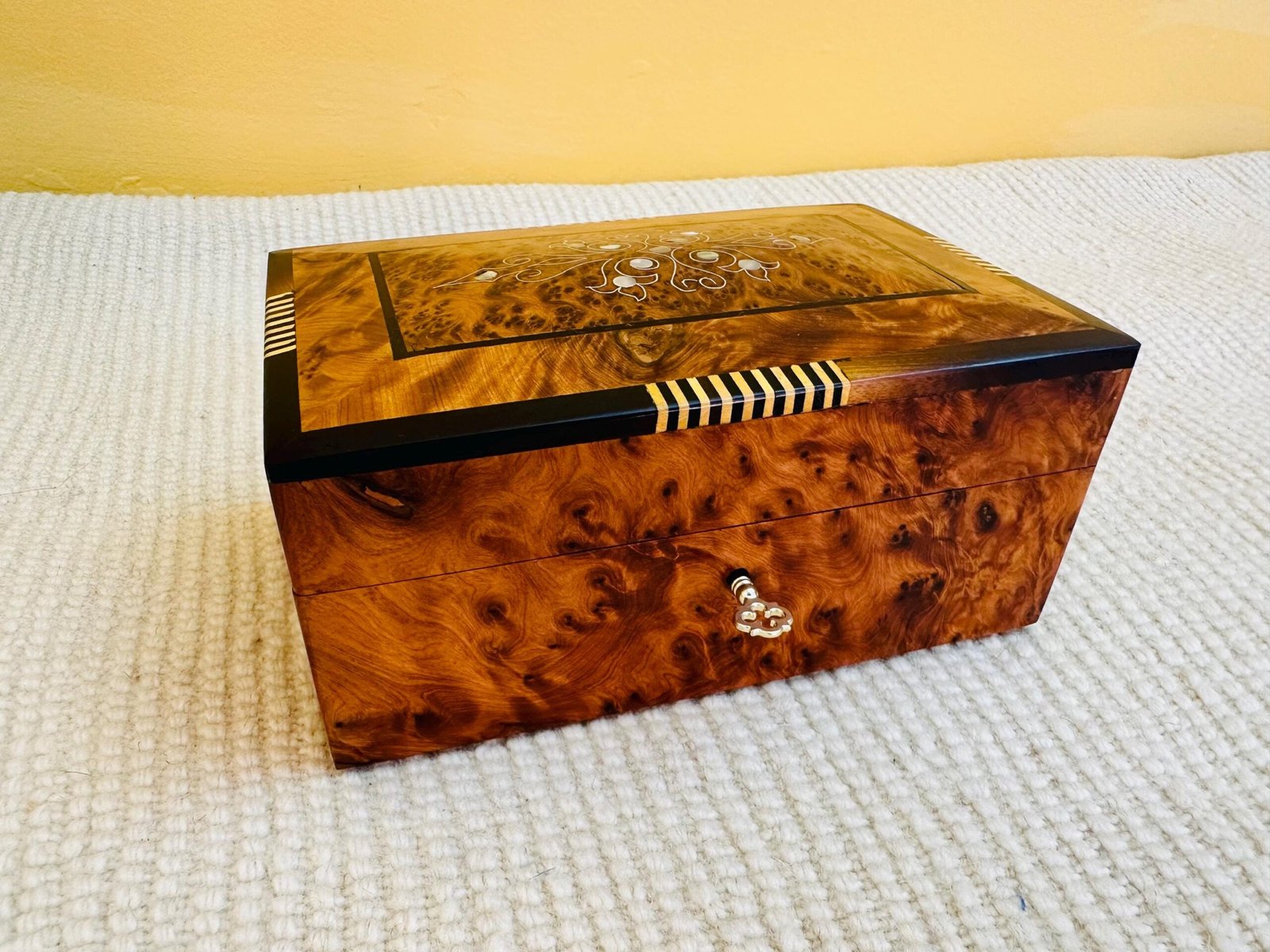 The exterior is a breathtaking mosaic of luminous Thuya burl wood, prized for its mesmerizing grain and rich, cedar-like aroma. The lid is the centerpiece, featuring a delicate floral motif created from iridescent Mother of Pearl, hand-set into the wood. This intricate marquetry is framed by bands of ebony and lemonwood, showcasing the artisan’s meticulous attention to detail.