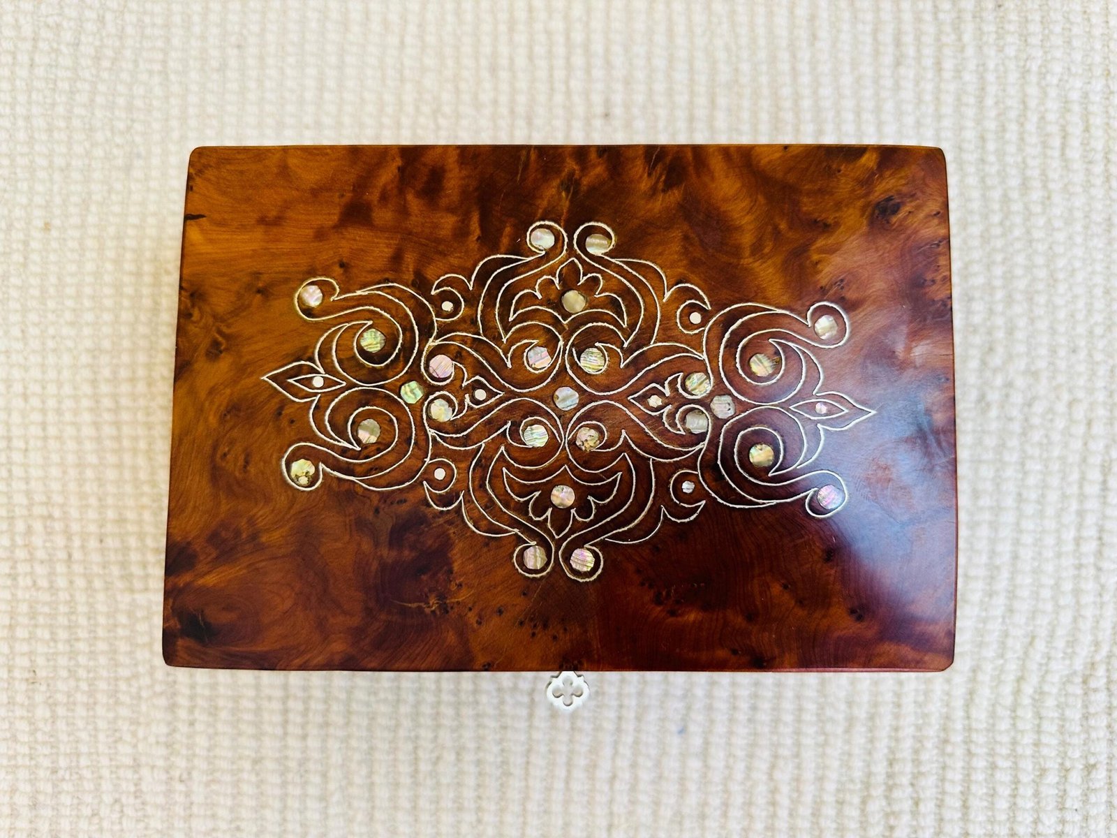 Vintage Moroccan Thuya Wood Jewelry Box – Abalone Marquetry Inlay