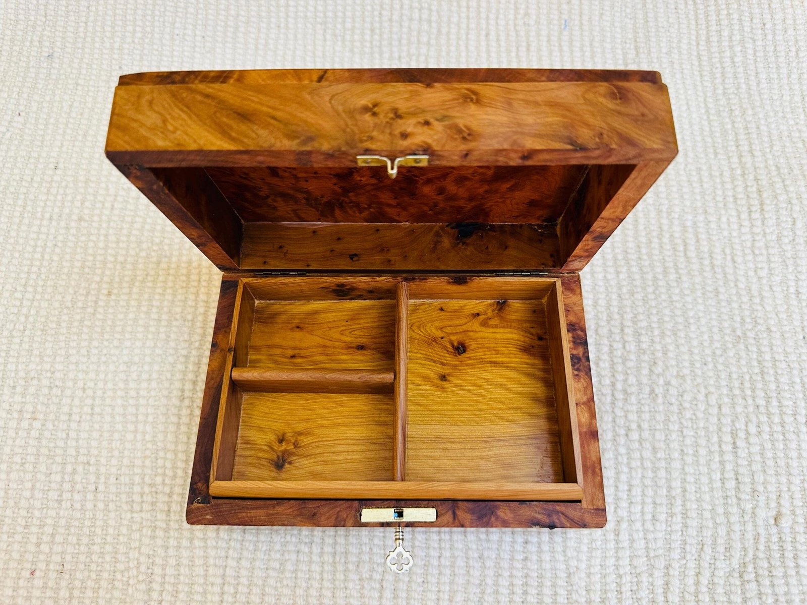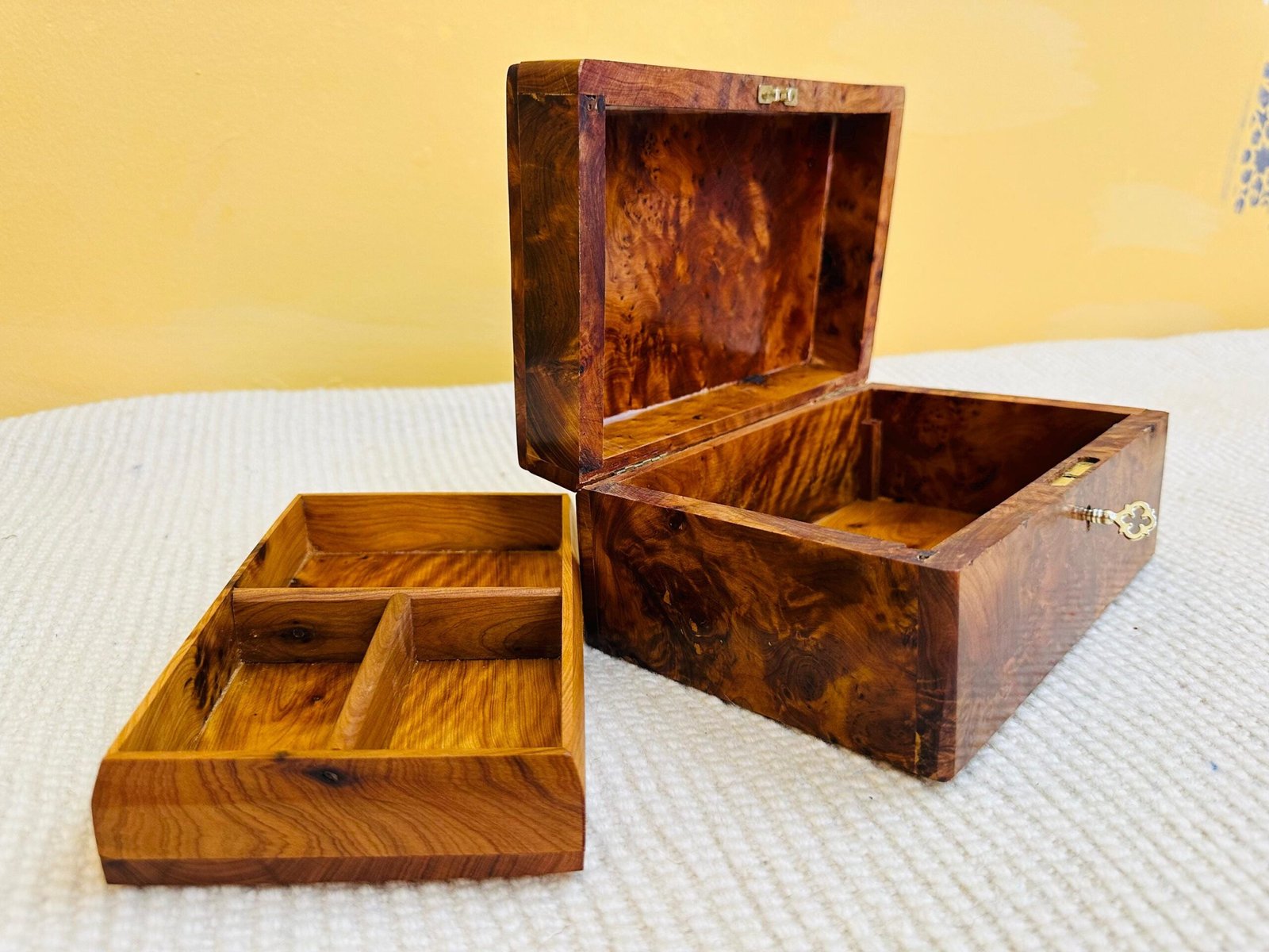 As a handmade vintage piece, no two boxes are exactly alike — the unique grain and inlay patterns are part of its character and history.